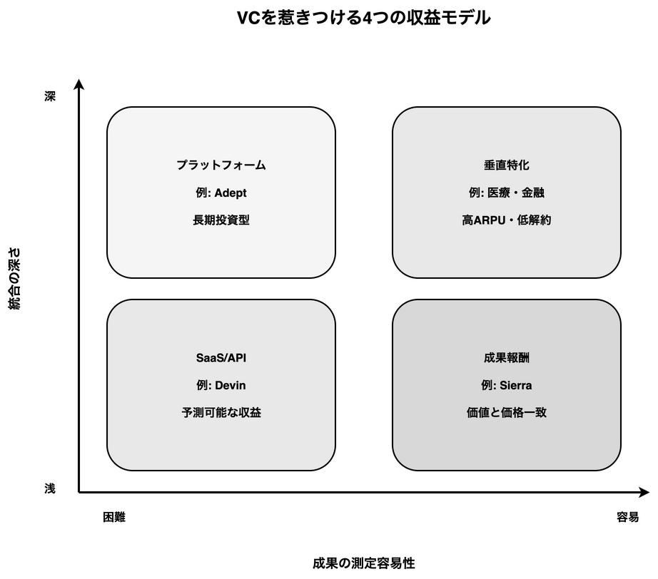 「解決の測定容易性」とは、AIエージェントが実行したタスクの成果を、誰の目にも明らかな数値や状態で測れるかどうか、ということです。一方で「統合の深さ」は、エージェントが企業の既存システムや特定の業務プロセスにどれだけ深く入り込む必要があるかを示します。この2つの軸で考えると、VCを惹きつける主要な4つの収益モデルが見えてくるのではないでしょうか。
