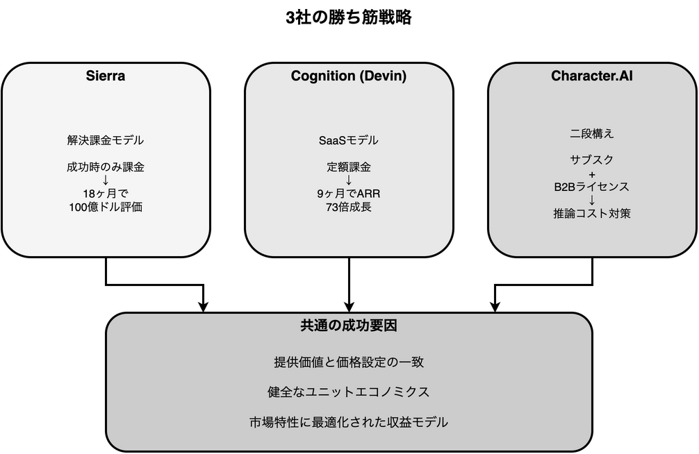 Sierra、Cognition、Character.AI。彼らの戦略は三者三様ですが、共通しているのは、自社の提供価値と市場の特性を深く理解し、それに最適化された収益モデルを構築している点です。それは、価値を直接価格に結びつけることであったり、予測可能な収益構造を築くことであったり、あるいは複数の収益パスを確保することであったりします。