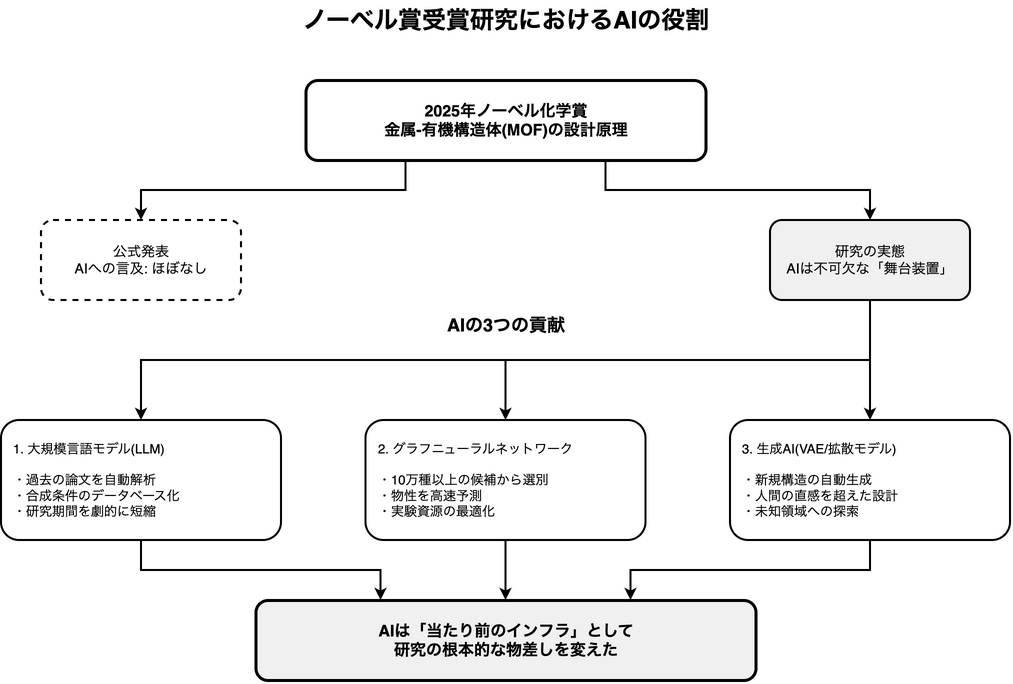 どうやら、公式発表の沈黙とは裏腹に、研究の最前線ではAIが不可欠な「舞台装置」としてフル稼働していたようです。それは、主役としてスポットライトを浴びることはなくとも、物語を受賞に値するクライマックスへと導いた、極めて重要な存在だったように思えます。