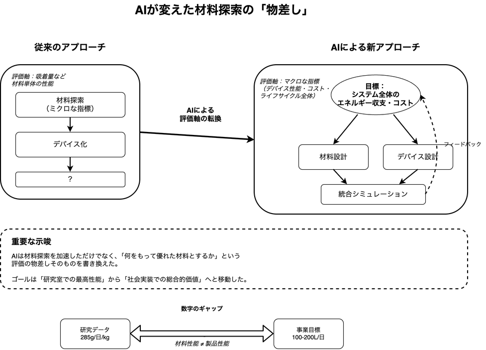 AIは研究開発のスピードを上げただけでなく、もっと根本的な部分、つまり「何をもって優れた材料とするか」という評価の『物差し』そのものを書き換えてしまったのではないか、という気がしてきました。