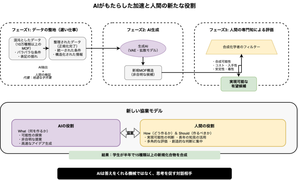 この新しい関係性は、研究者の働き方すら変えつつあるようです。ノーベル化学賞を受賞したヤギー(Yaghi)グループでは、LLMなどを活用したワークフローを導入することで、研究室に加わったばかりの学生が、わずか半年で15種類以上もの新規化合物を合成するという成果を上げています。これは、AIが膨大な知識の探索や初期アイデアの生成といった作業を肩代わりし、人間がより創造的で専門性の高い「判断」や「実験」に集中できるようになった結果だと考えられないでしょうか。