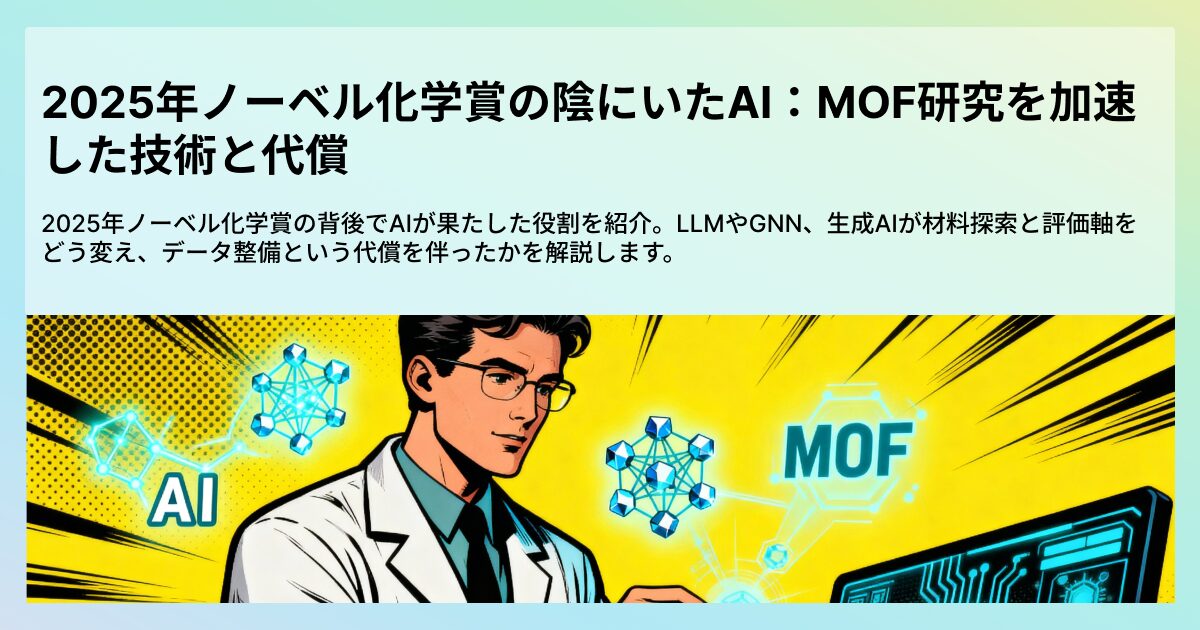 AIは、ノーベル賞という華やかな舞台の主役ではありませんでした。しかし、その舞台を整え、物語を加速させ、MOFという技術を「受賞に値する状態」へと導いた重要な存在だったことは間違いない気がします。