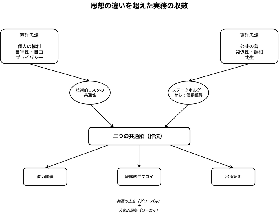そう考えると、「個人権」対「公共善」という壮大な対立軸も、少し違って見えてきます。もしかすると私たちは、技術的な共通リスクを管理するための土台(三つの作法というガードレール)をグローバルに共有し、その上で、それぞれの文化が重視する価値(個人権か、公共善か)に応じて運用を調整する、という「二層構造」のアプローチに自然とたどり着きつつあるのかもしれません。