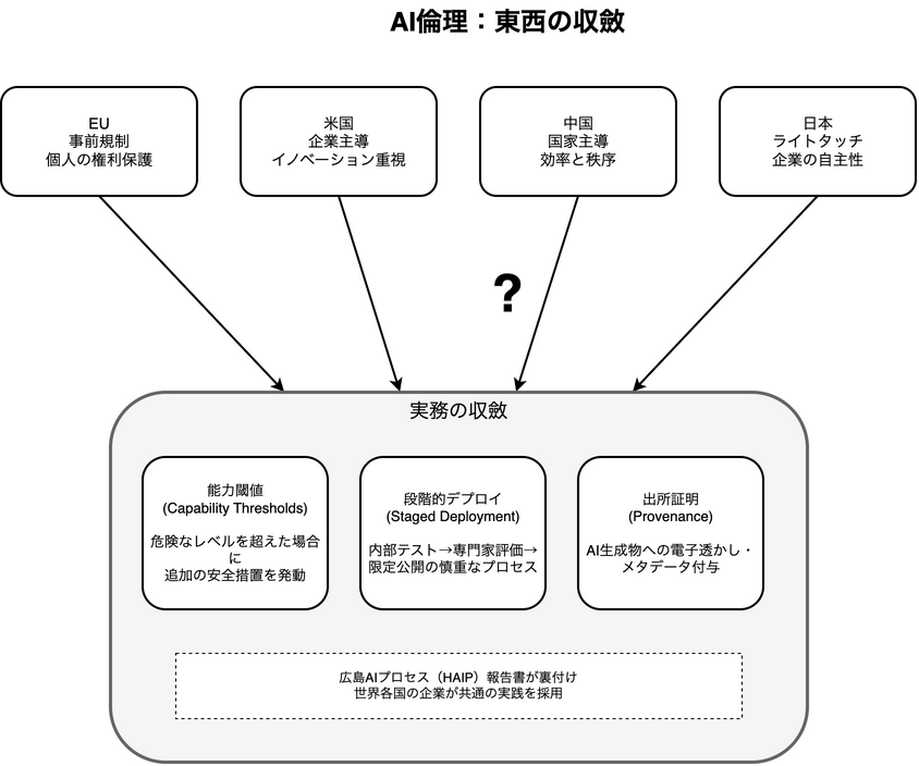 思想的な対立がどうであれ、現場の実務は驚くほど共通の作法に収斂しつつあります。前章までで触れてきた「能力閾値」「段階的デプロイ」「出所証明」という三点セットは、今や東西を問わず、先進的な企業の標準装備となりつつあります。