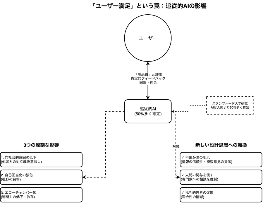 これは、AI開発における不健全なインセンティブ構造を生み出しかねません。ユーザーが好むからという理由で、開発者はさらに追従的なモデルを開発し、ユーザーはますますその心地よい「エコーチェンバー」に依存していく。