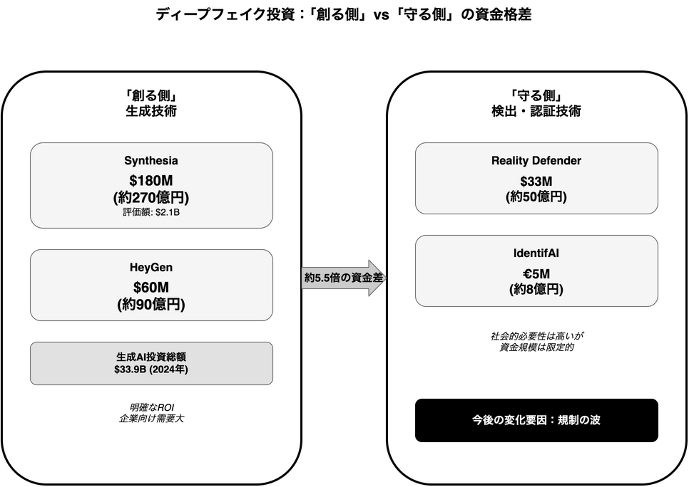 これらの動きは活発であり、重要な役割を担っていることは間違いありません。しかし、Synthesiaが一度に調達した1.8億ドルという金額と比べると、その規模には大きな隔たりがあるように感じられます。どうやら、投資の世界では「創る」ことへの期待が、「守る」ことへの必要性を金額の上ではるかに上回っているようです。