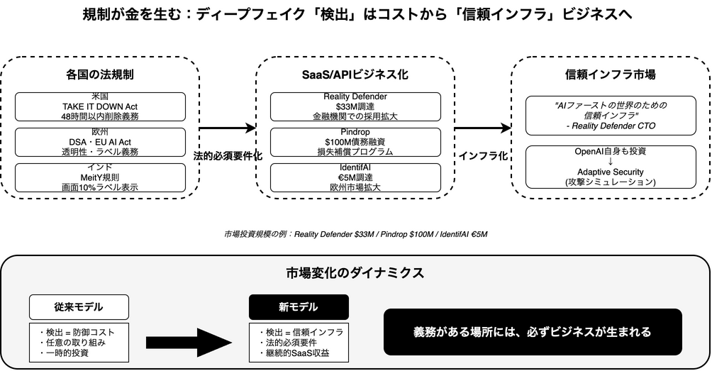 これらの規制は、もはやディープフェイク対策を企業の「自主的な取り組み」から「法的な必須要件」へと変えました。そして、義務がある場所には、必ずビジネスが生まれます。