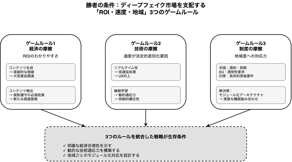資金調達のニュースを深く読み解いていくと、どうやら勝敗を分ける3つの大きな「摩擦」が見えてきた気がします。それは、明確な投資対効果を求める「経済の摩擦」、技術進化のスピードに対応し続ける「技術の摩擦」、そして国ごとに異なるルールに適応する「制度の摩擦」です。この3つのルールを理解することこそが、ディープフェイクという複雑な市場を航海するための羅針盤になるのかもしれません。