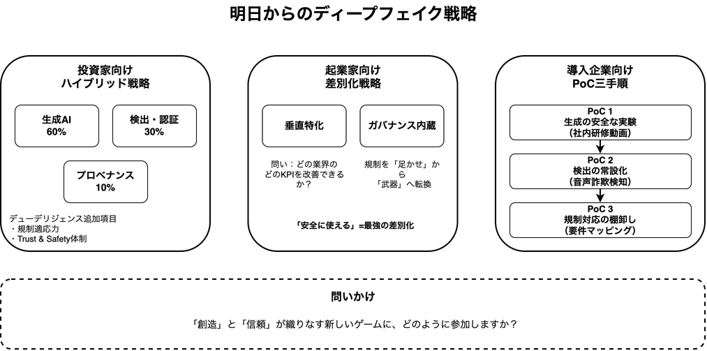 この記事もいよいよ最後のセクションです。ここまでの分析を踏まえ、それぞれの立場にいる私たちが、明日から具体的にどう動けばいいのか。投資家、起業家、そしてこの技術の導入を検討する企業、それぞれの視点から、実践的な戦略ガイドを考えてみたいと思います。これは、変化の激しいディープフェイク市場を航海するための、具体的なアクションプランです。