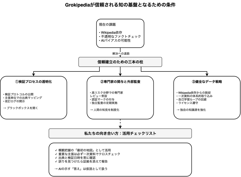 Grokipediaが単なる「速いだけの百科事典」ではなく、公共的に信頼される知識基盤となるためには、マスク氏の宣言だけでなく、その「真実」を担保する制度設計が不可欠です。専門家たちの指摘を紐解くと、その道筋は三本の柱に集約されるように思います。