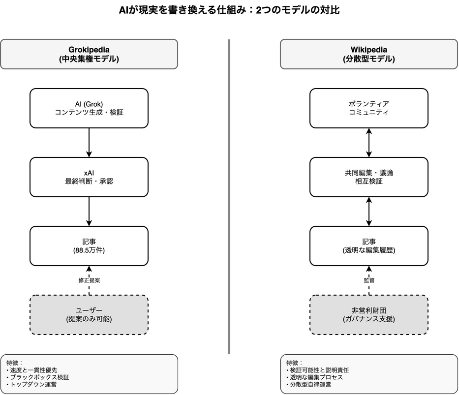 | 生成と編集 | AIが主導し、ユーザーは提案のみ | ボランティアが共同で編集・議論 |