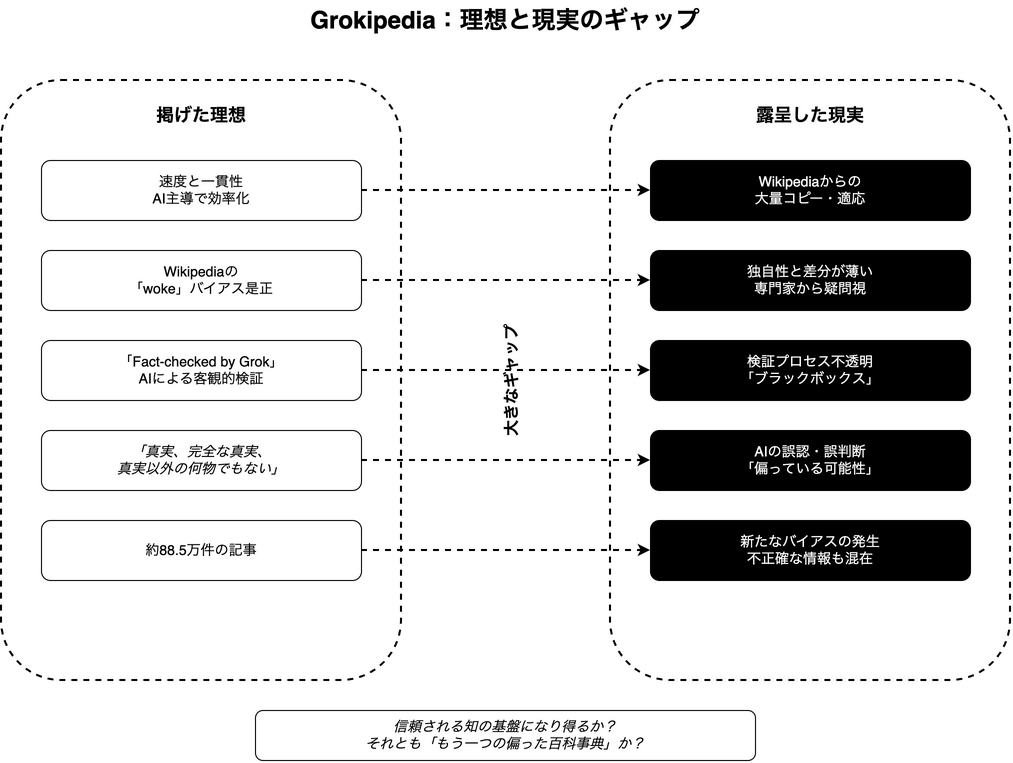 これは、約88.5万件という膨大な記事数を短期間で確保するための現実的な戦術だったのかもしれません。しかし、Wikipediaのバイアスを是正すると宣言しながら、その土台の上に自らの城を築いているという事実は、Grokipediaの独自性と信頼性に大きな疑問符を投げかけました。期待された大幅な差分や独自検証が薄いとの指摘は、専門家からも相次いでいます。