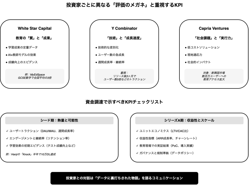 あなたの事業が「教育の質」を追求するモデルなら、White Star Capitalのような投資家とは良い対話ができるかもしれません。その際は、AIが教育のどの部分を補強し、それがいかに具体的な学習成果に結びついているかを、数字で語る準備が必要になるでしょう。
