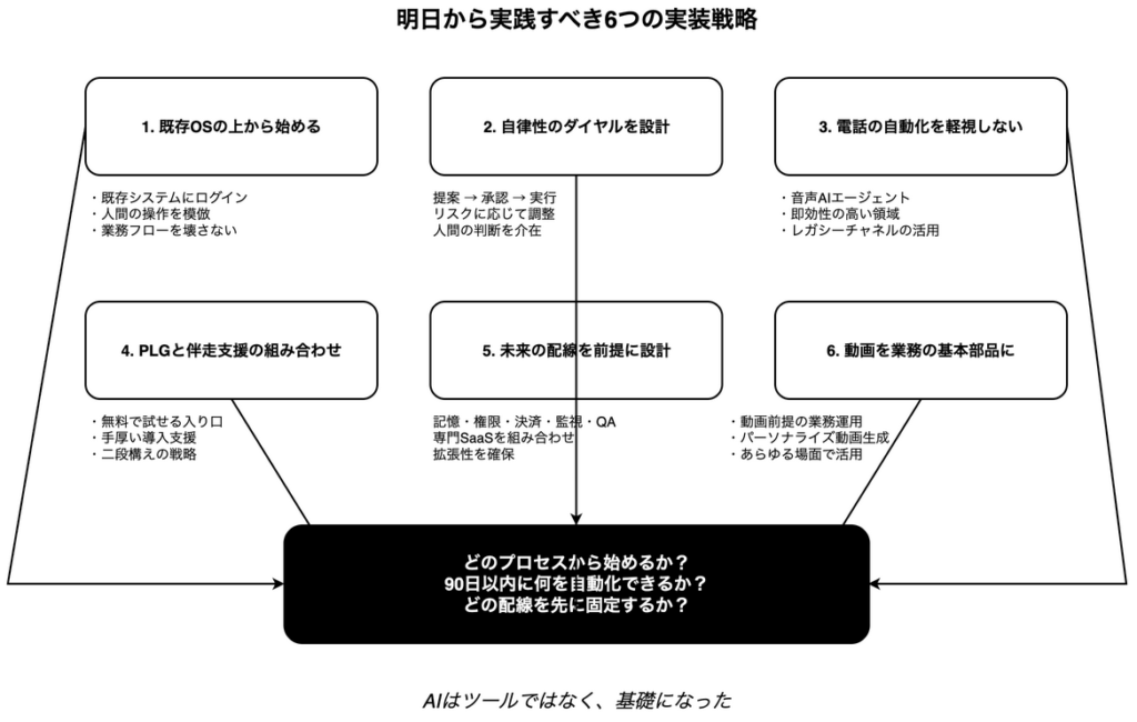 さて、あなたの現場では、どのプロセスからAIエージェントに任せることができるでしょうか。どの業務であれば、90日以内に「提案→承認→自動実行」のサイクルを回し始めることができるでしょうか。そして、どの「配線」を先に固定すれば、来年の拡張に耐えうる頑健な事業を築けるでしょうか。