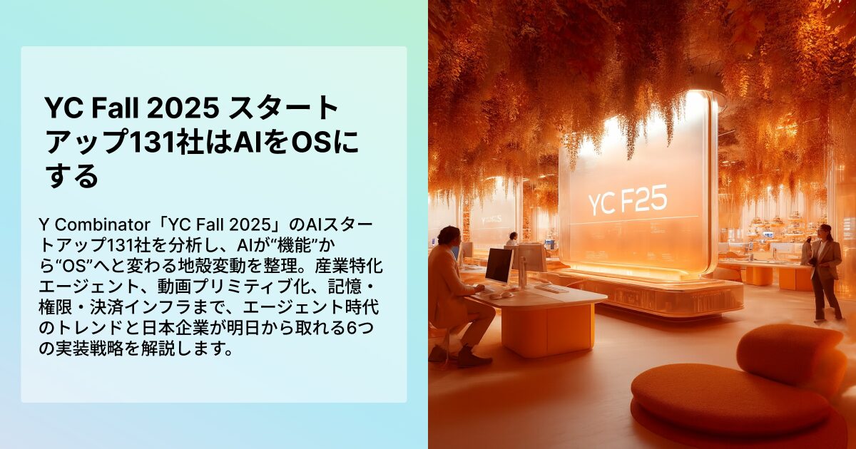 今回はYCのF25のスタートアップを調査して、AIスタートアップのトレンドをまとめてみました。結論から言うと、世界最高峰のアクセラレーターY Combinator(YC)の2025年秋バッチ(Fall 2025)は、「AIを機能として上に乗せる」のではなく、「事業の前提としてOSのように下から支える」スタートアップが主役になった、そんな気がしています。